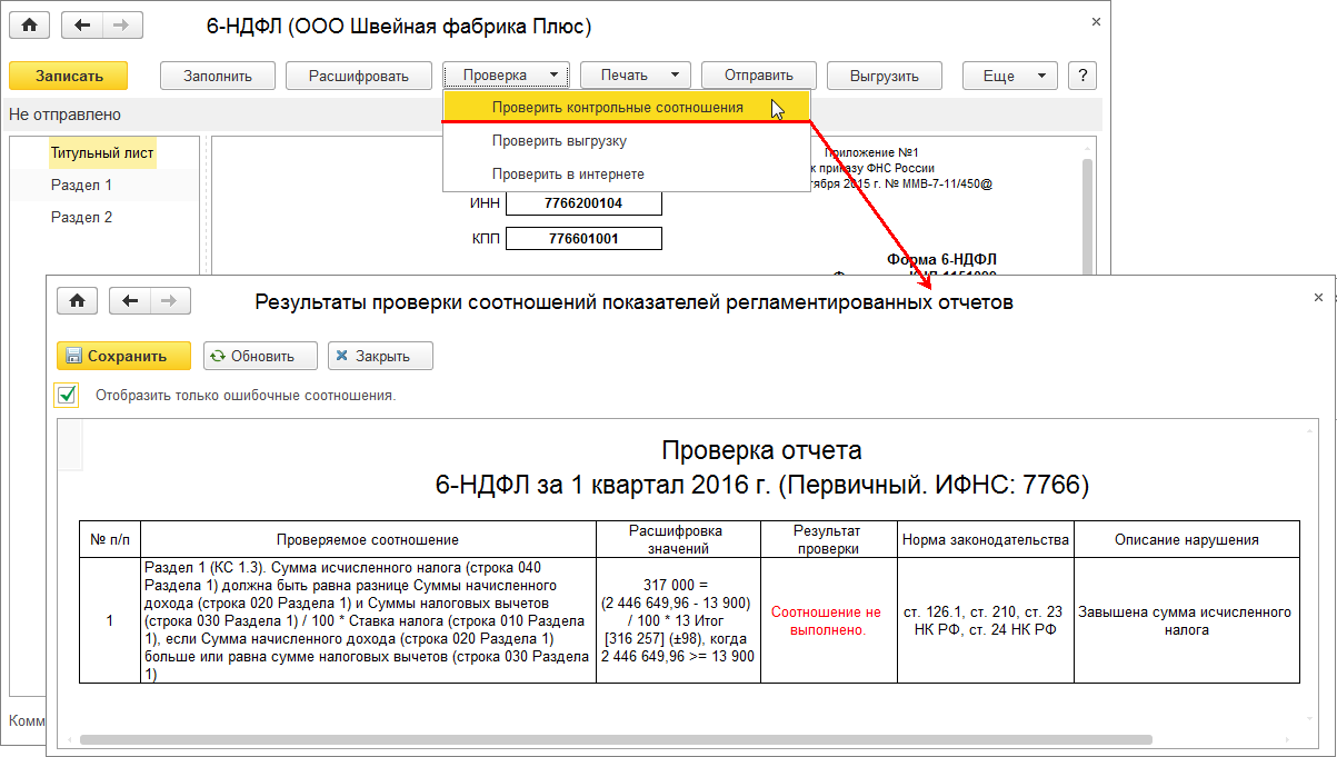 Осталось его проверить. Вручную это можно сделать, сформировав в той же «1С» расчетную ведомость за тот же период. При корректном заполнении отчета показатели строк 110 «Сумма начисленного дохода» и 140 «Сумма исчисленного налога» в 6-НДФЛ должны совпадать с итогами по графам «Всего начислено» и «Всего удержано» в расчетных ведомостях за тот же период.